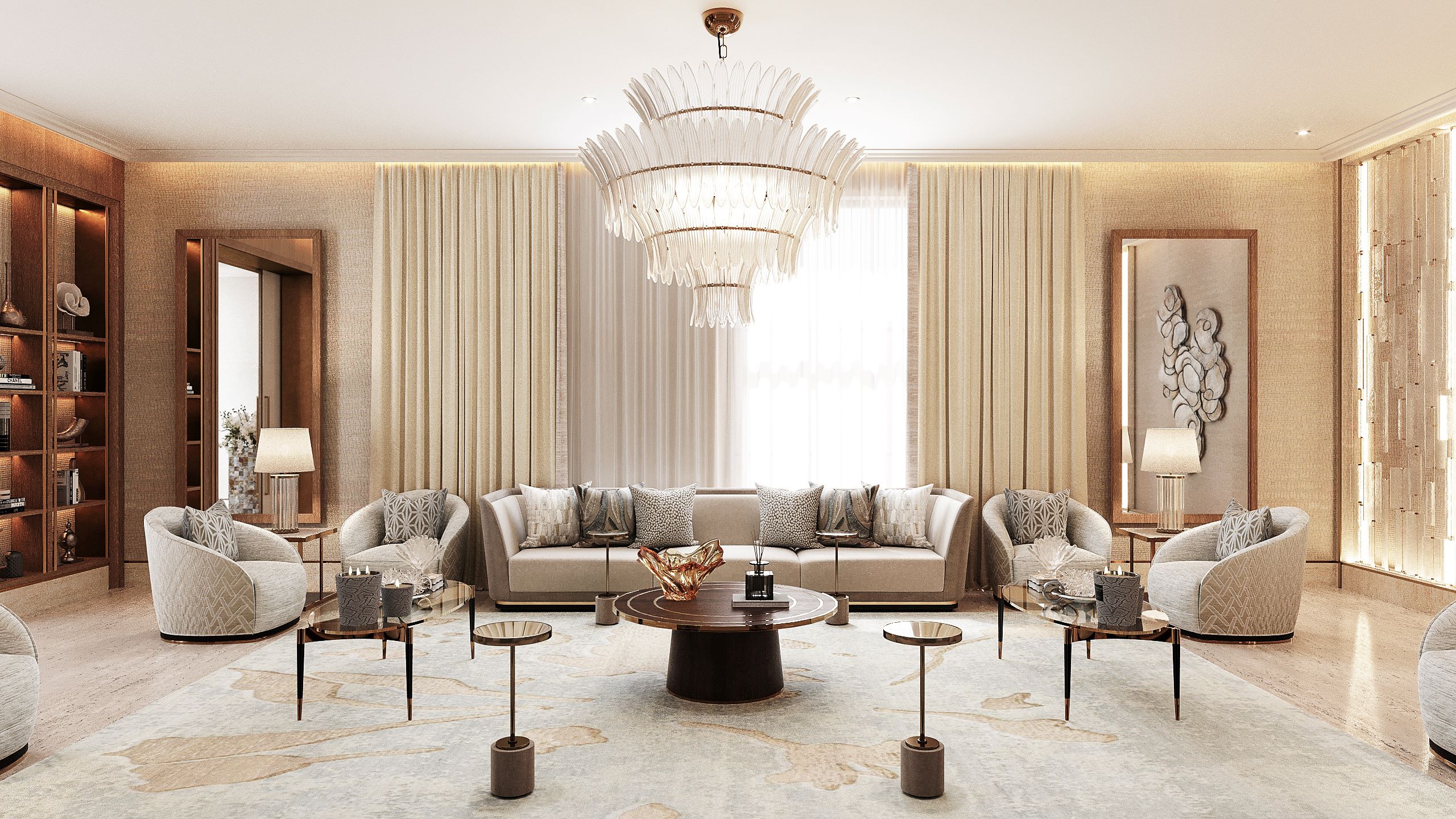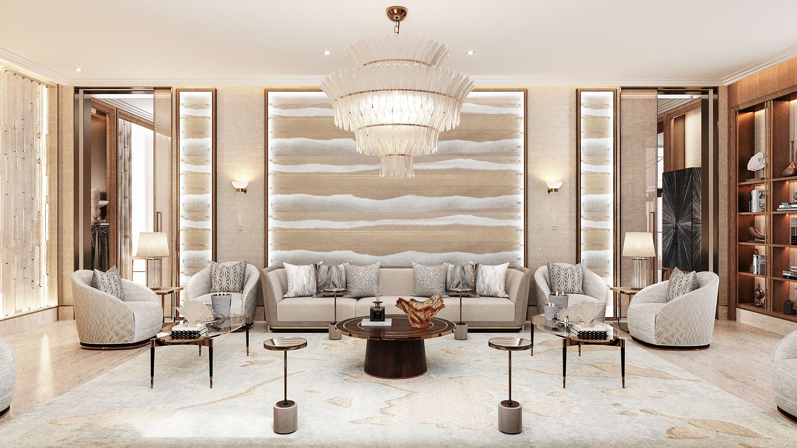 In the majlis soft neutrals such as rich cream and subtle taupe create a feeling of calm tranquility. Texture is introduced with the incorporation of materials such as wood, Murano glass, silk, crystal and ceramic. The arrangement of the room showcases a stunning handcrafted wall installation resembling the petals of a flower. On either side, decorative crystal panels with cove lighting generate a soft warm radiance. A striking multi-tiered chandelier handcrafted with textured Murano leaves forms a standout centerpiece illuminated by cove lighting in the evening and natural light in the day. A hand-painted wallcovering combines soft gold, silver, and platinum tones in a design reminiscent of organic rock strata or a soft-hued landscape.