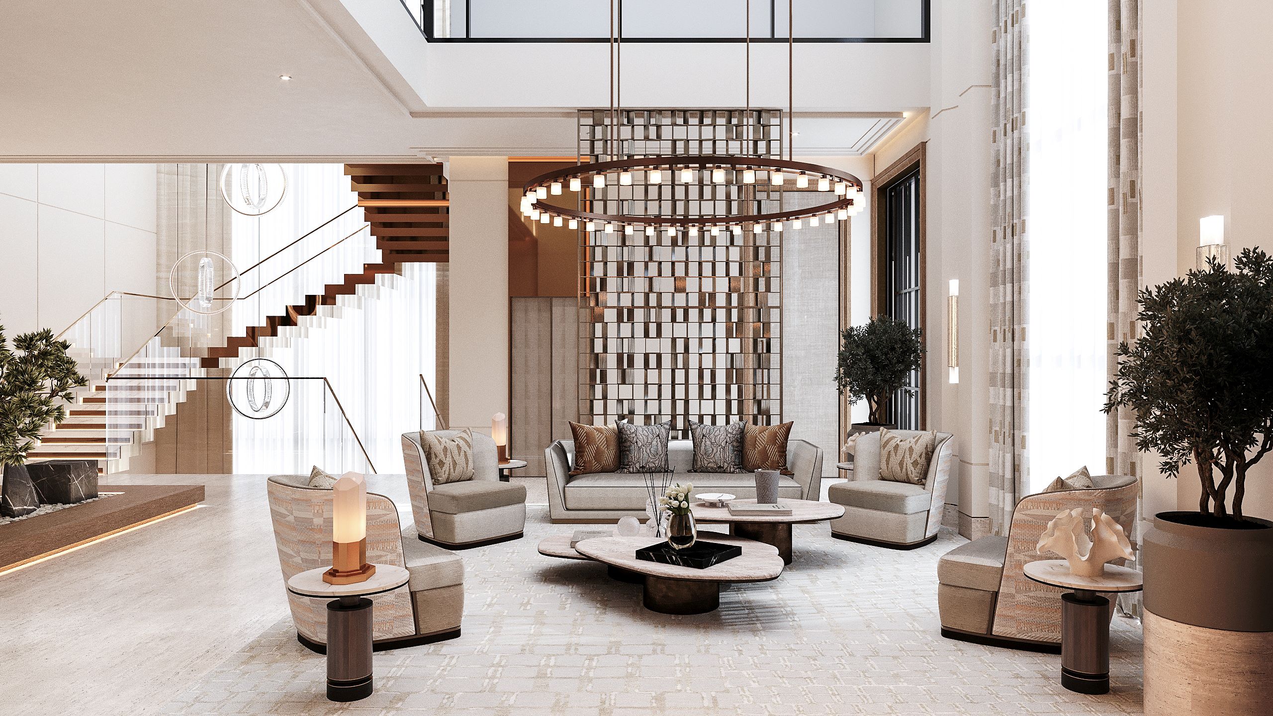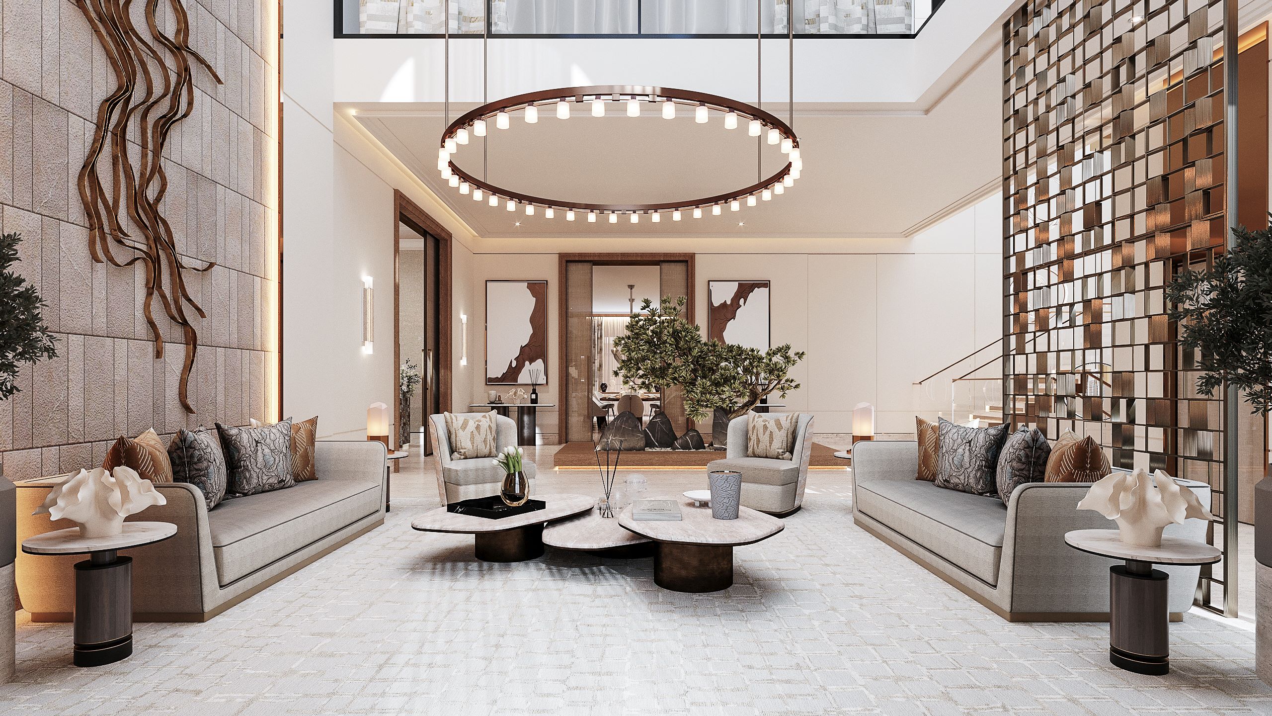 Intriguing sculptural forms characterize the design of the grand double-height lobby. The layout features a symmetrical seating arrangement with two sofas and four swivel chairs, within an interior landscape of potted trees and decorative marble stones. These organic elements are juxtaposed beautifully with rectangular patterned textured travertine cladding, an abstract metallic artwork installation and a vast circular bronze chandelier.  Circular motifs and curvilinear forms interplay with geometric lines and straight-edged patterns. A metal decorative partition with a repeating lattice pattern serves as both a functional and decorative element, separating the seating area from the hallway while maintaining a sense of openness.