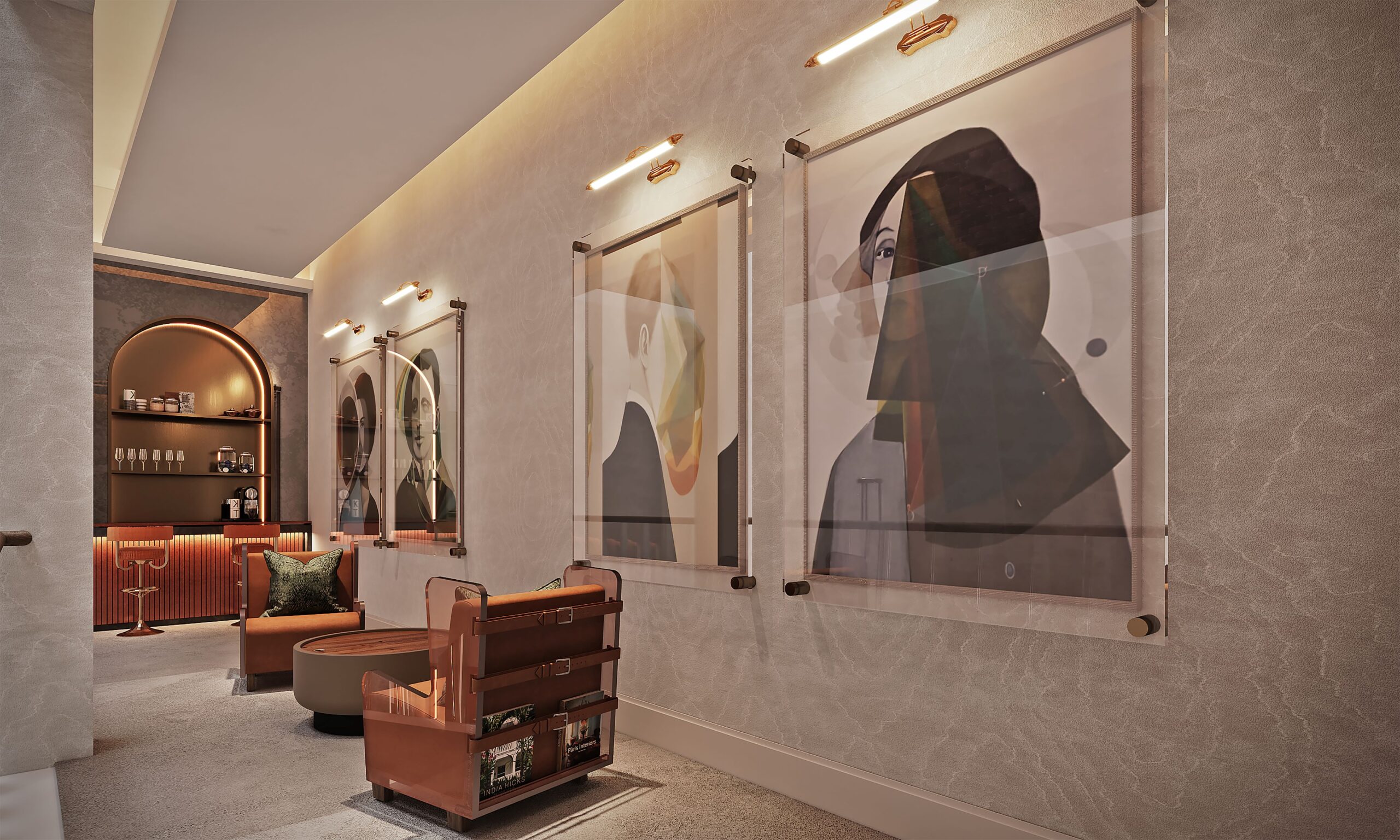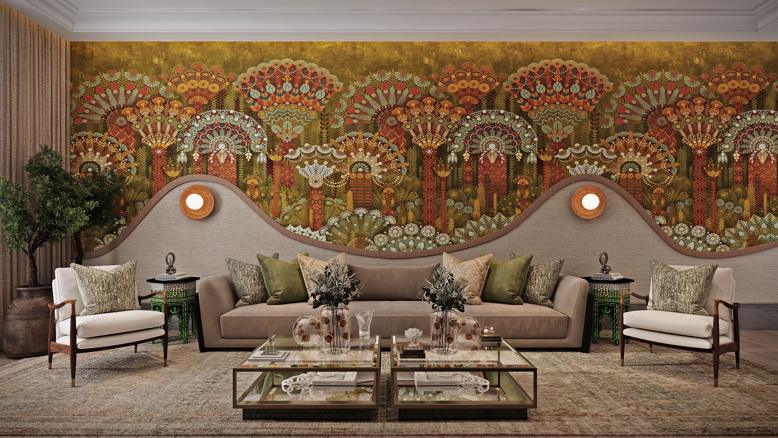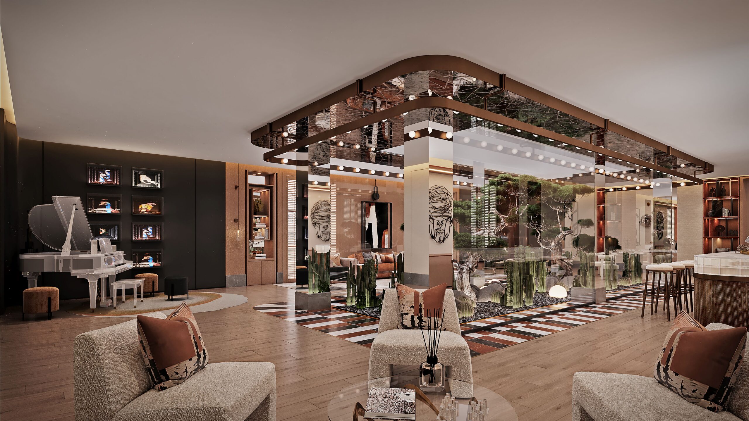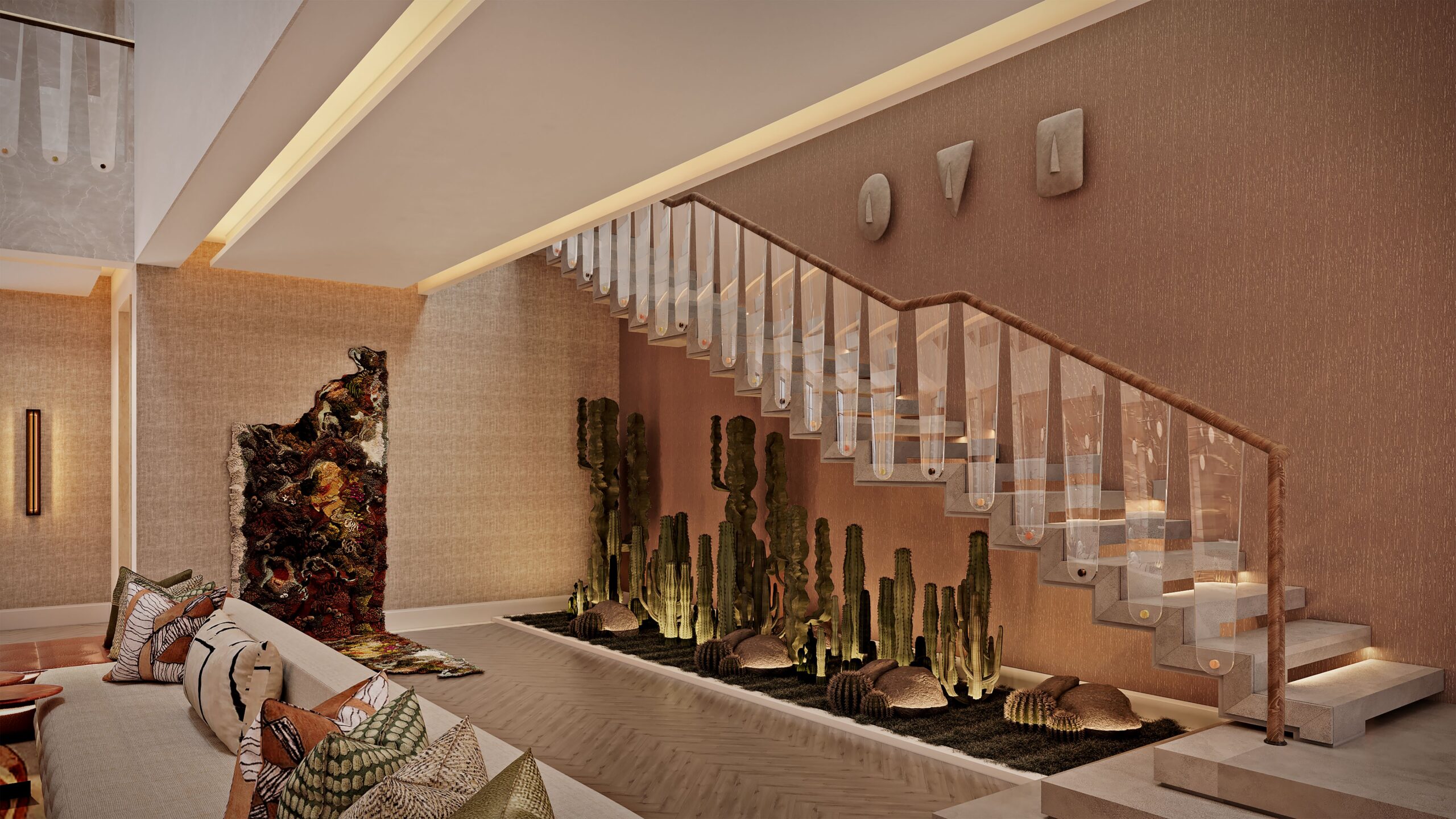 The men’s gathering majlis embodies a midcentury modern aesthetic, incorporating green clay ceramic tiling, oak veneer wall cladding, herringbone parquet flooring and an atomic chandelier. A space for dining, entertaining and gathering across two floors, the design of the men’s majlis creates a warm and inviting ambience. Statement design elements such as an acrylic staircase, graphic portraits, cactus trees and a hand-painted wall piece reflect the owner’s bold and sophisticated artistic taste. Intriguing creative innovations continue into the ground floor lobby and ground floor majlis. A glass atrium containing a cactus garden and bonsai tree provides a striking focal point that divides the space. The ground floor majlis showcases a vibrantly patterned wall hanging which adds texture and depth.