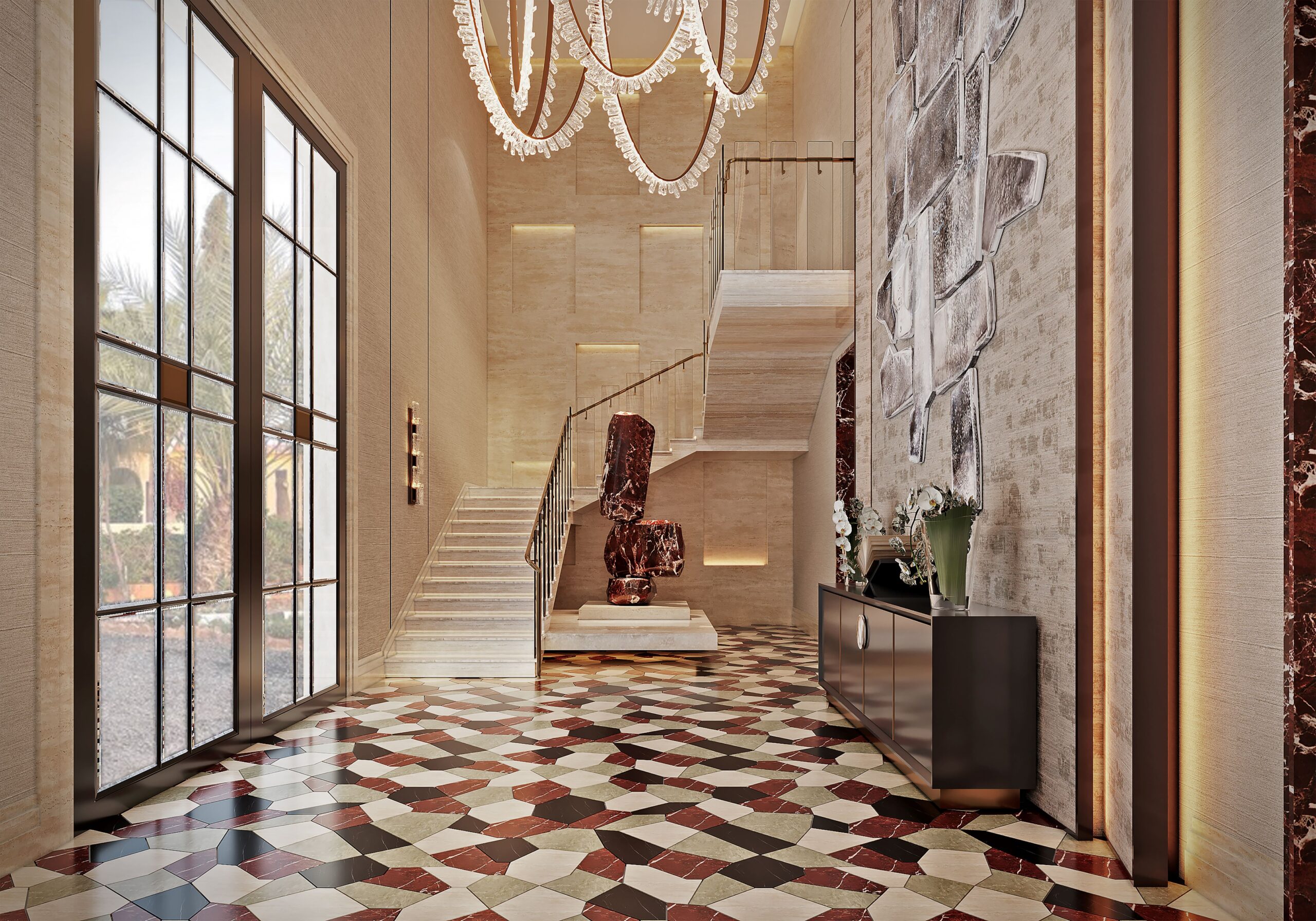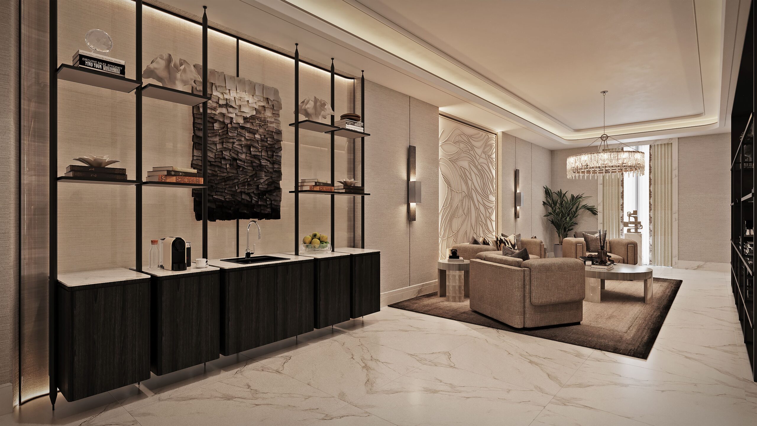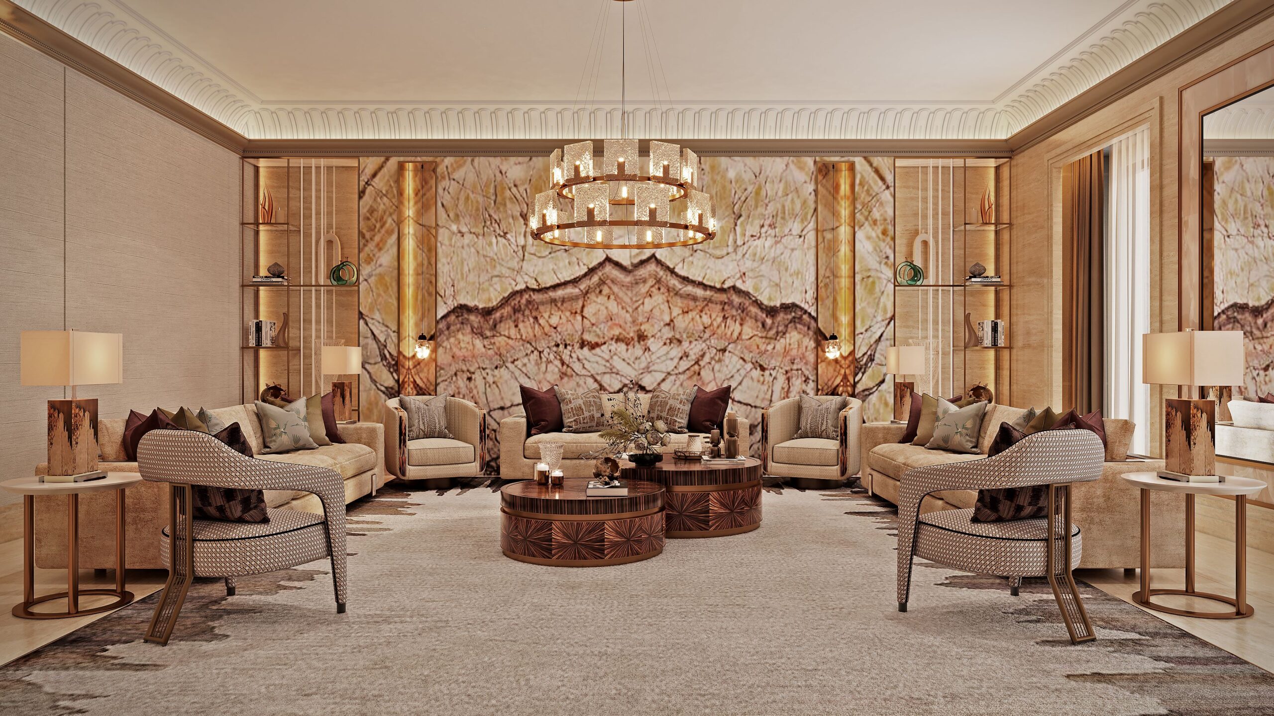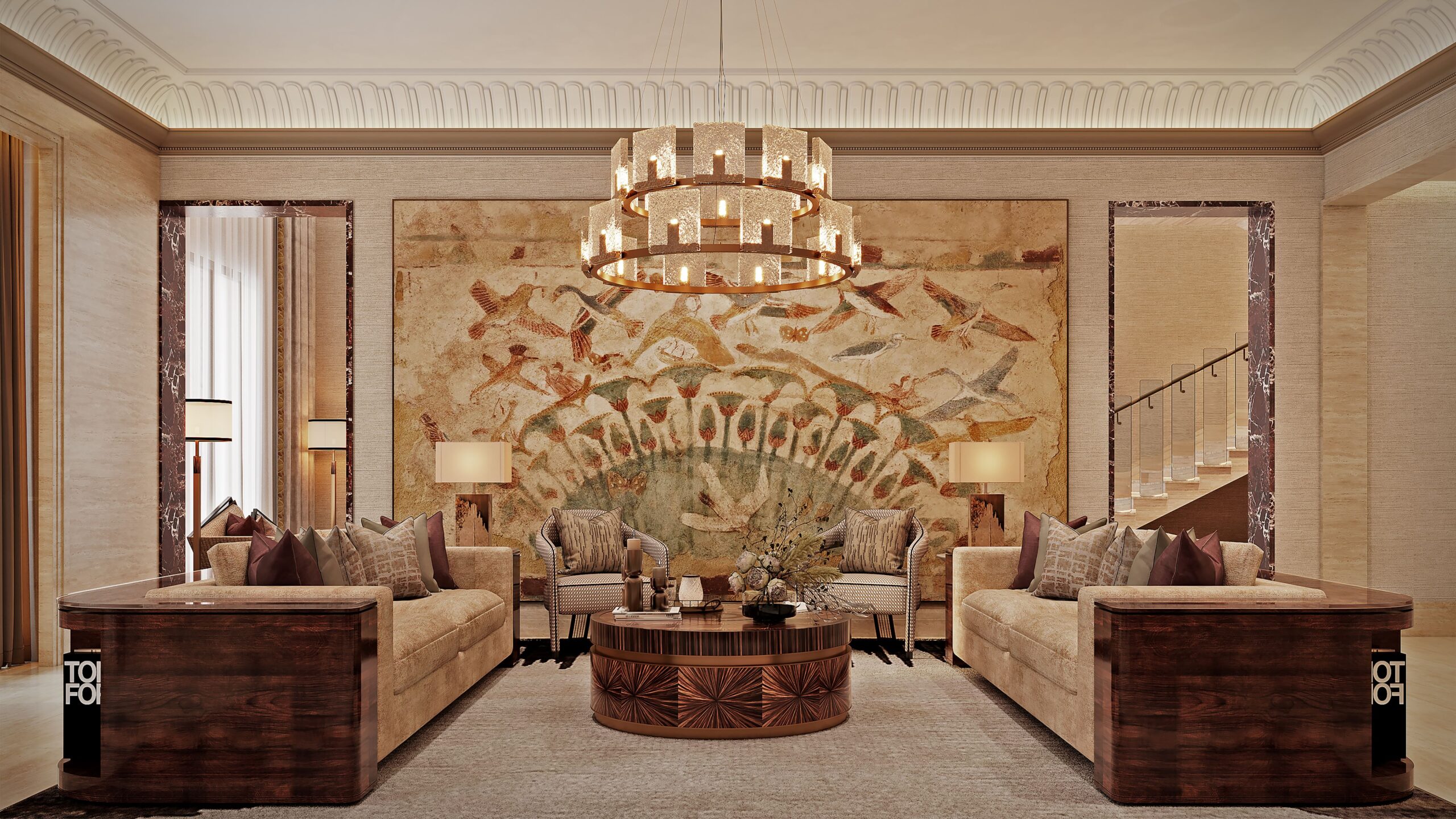 A striking double-height lobby showcasing a four-marble floor, draped contemporary chandelier and custom-made abstract mirror welcomes visitors into the residence. Materials have been carefully selected to create a dynamic and richly textured entrance. The earthy tones featured in the distinctive marble flooring introduce the neutral, bronze and burgundy color palette that unifies the space. Two burgundy marble framed entrances open into the basement majlis. In the majlis, the eye is drawn to the natural beauty of an open book marble wall and a wallcovering featuring an ancient Egyptian representation of the Nile. These stunning focal points offer moments of luxurious artistry. Â The space is infused with exquisite attention to detail, from shelves lined with antique gold bronze to a bespoke carpet and handblown glass chandeliers.