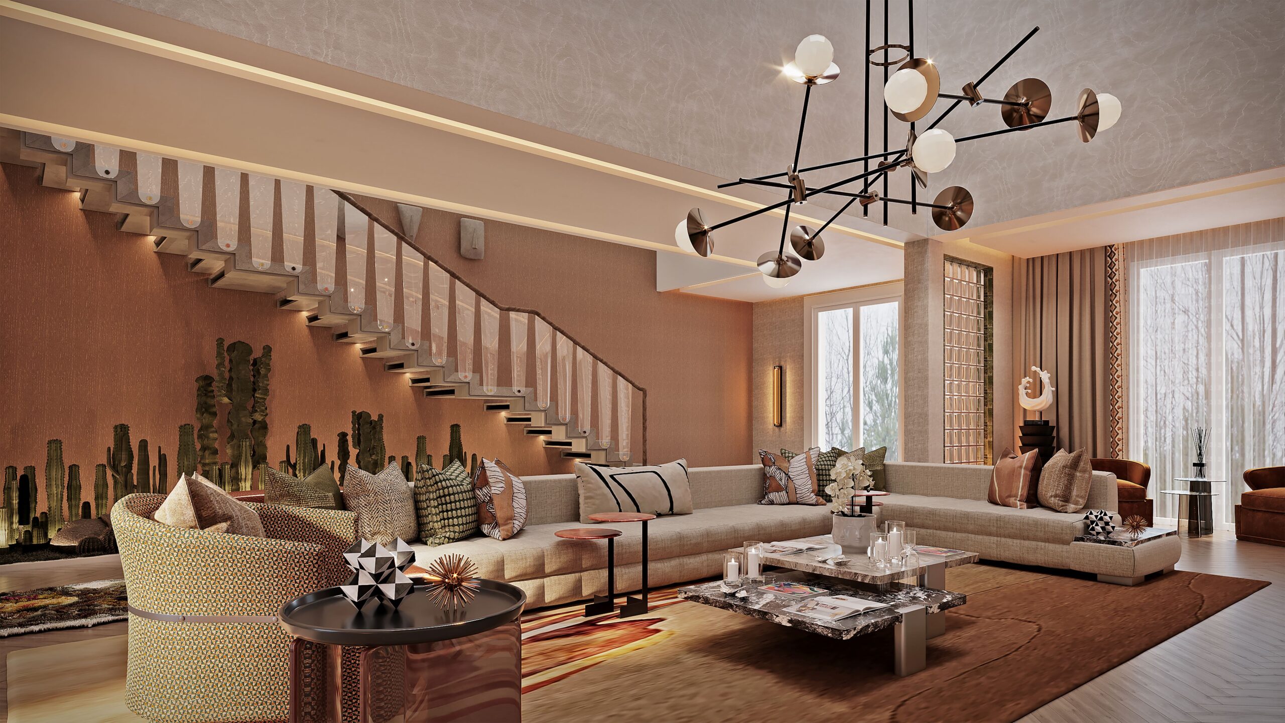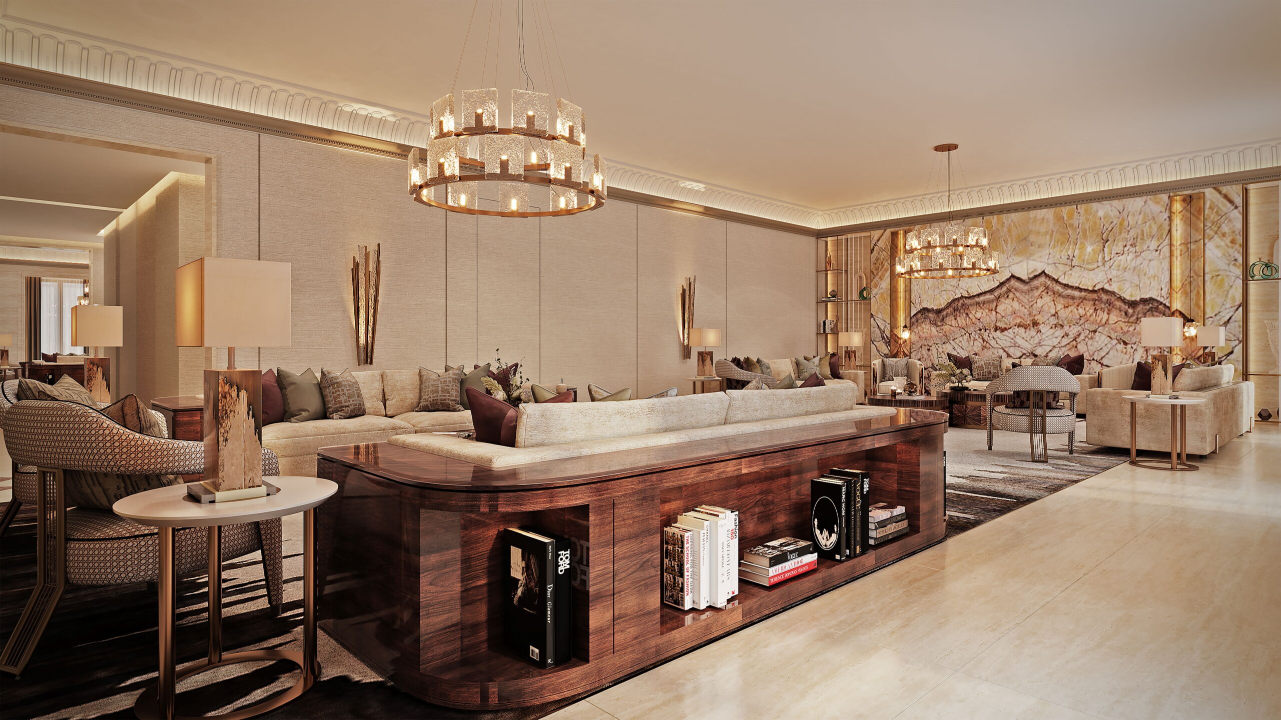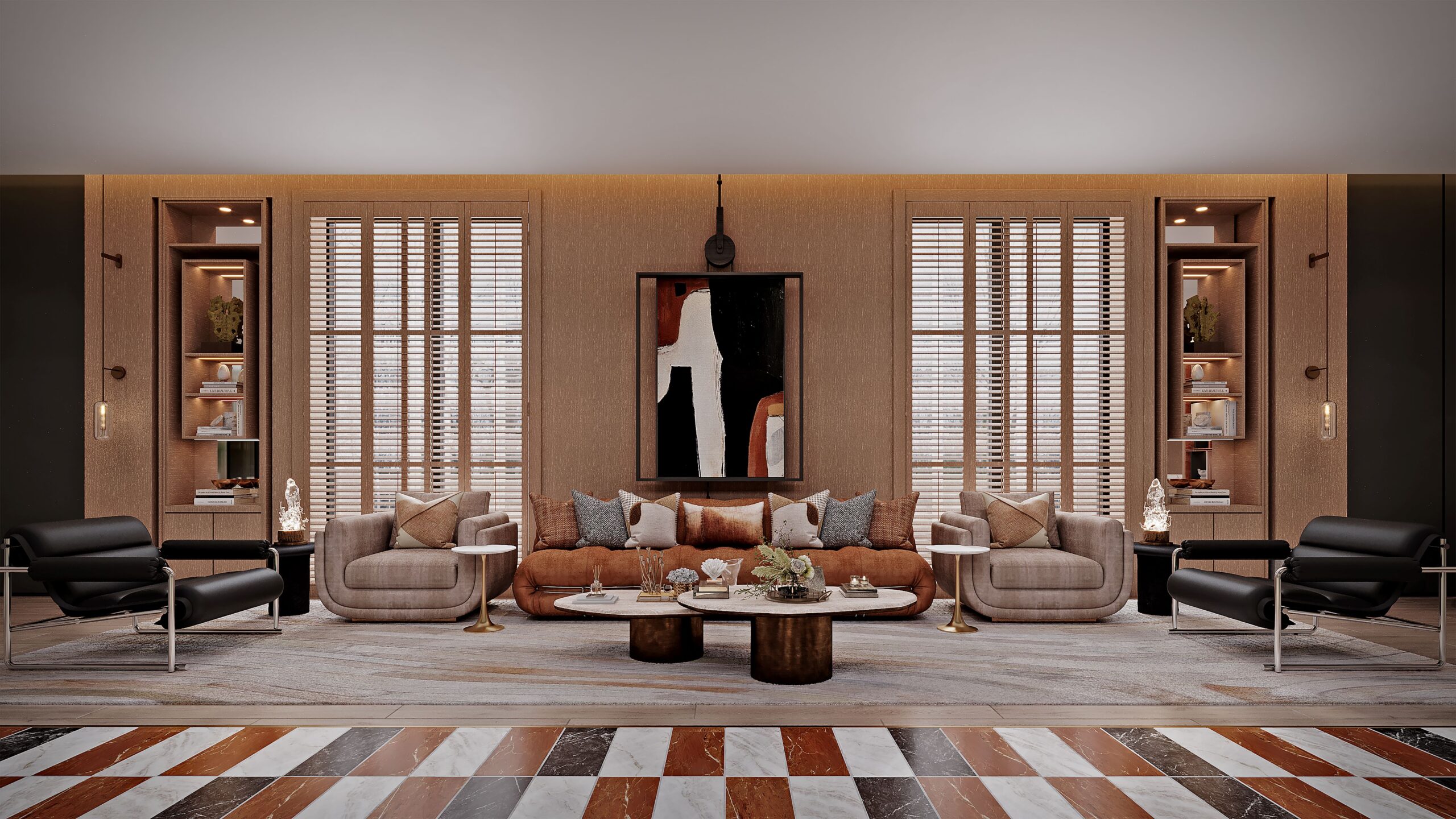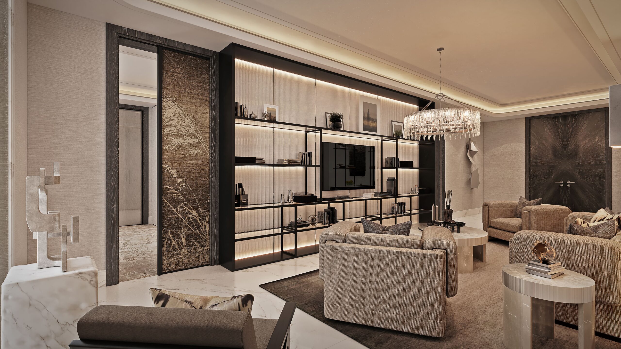 A striking double-height lobby showcasing a four-marble floor, draped contemporary chandelier and custom-made abstract mirror welcomes visitors into the residence. Materials have been carefully selected to create a dynamic and richly textured entrance. The earthy tones featured in the distinctive marble flooring introduce the neutral, bronze and burgundy color palette that unifies the space. Two burgundy marble framed entrances open into the basement majlis. In the majlis, the eye is drawn to the natural beauty of an open book marble wall and a wallcovering featuring an ancient Egyptian representation of the Nile. These stunning focal points offer moments of luxurious artistry. Â The space is infused with exquisite attention to detail, from shelves lined with antique gold bronze to a bespoke carpet and handblown glass chandeliers.