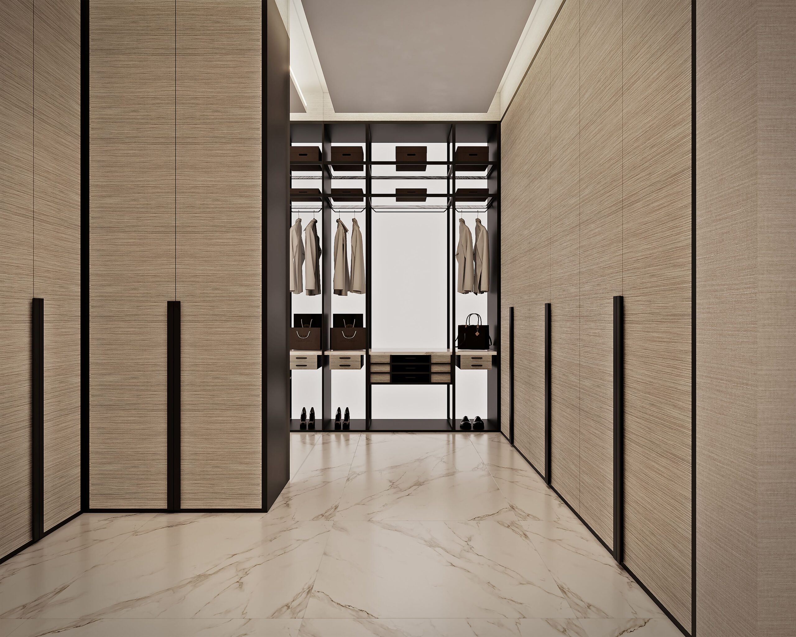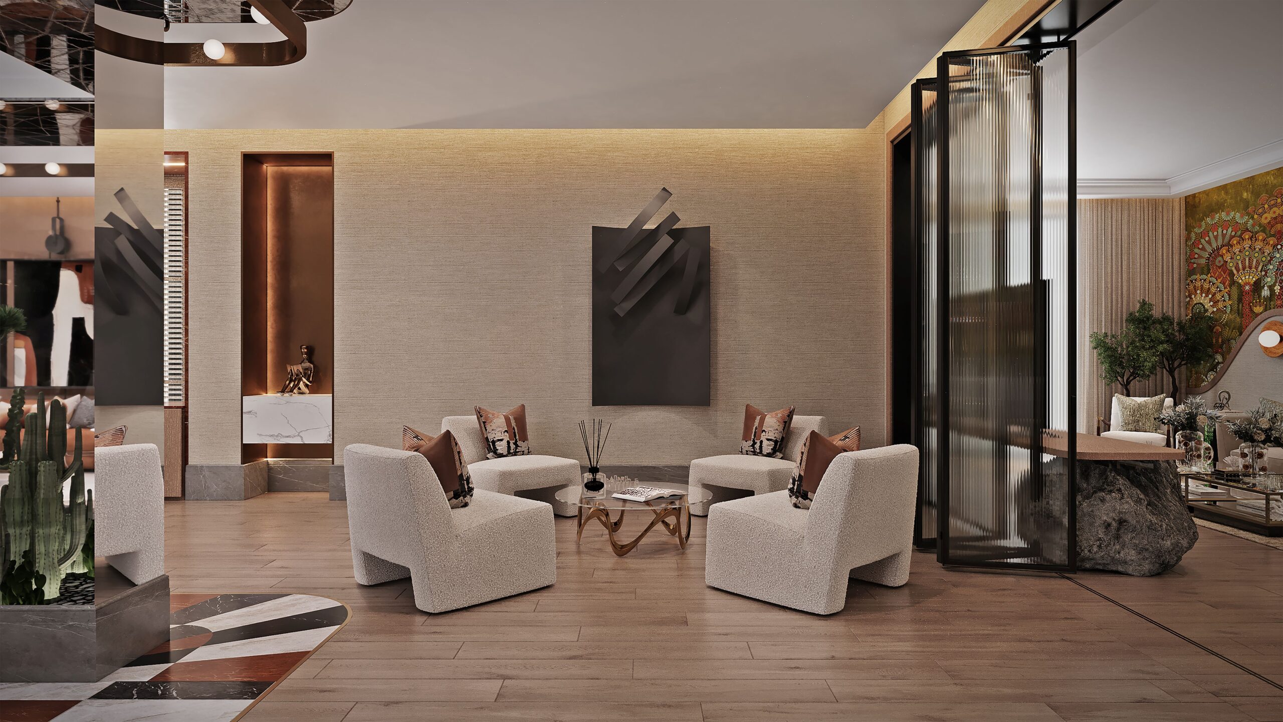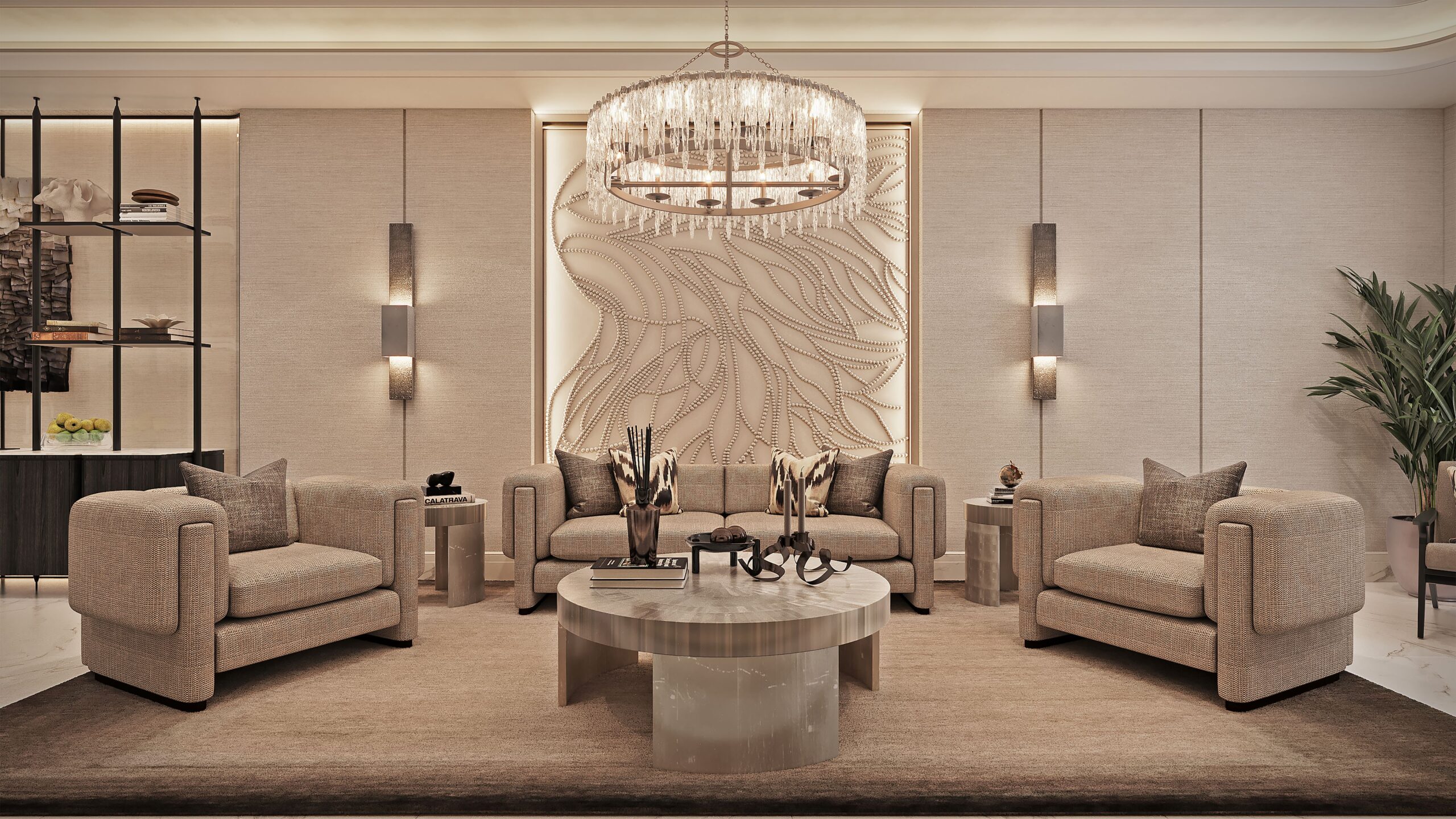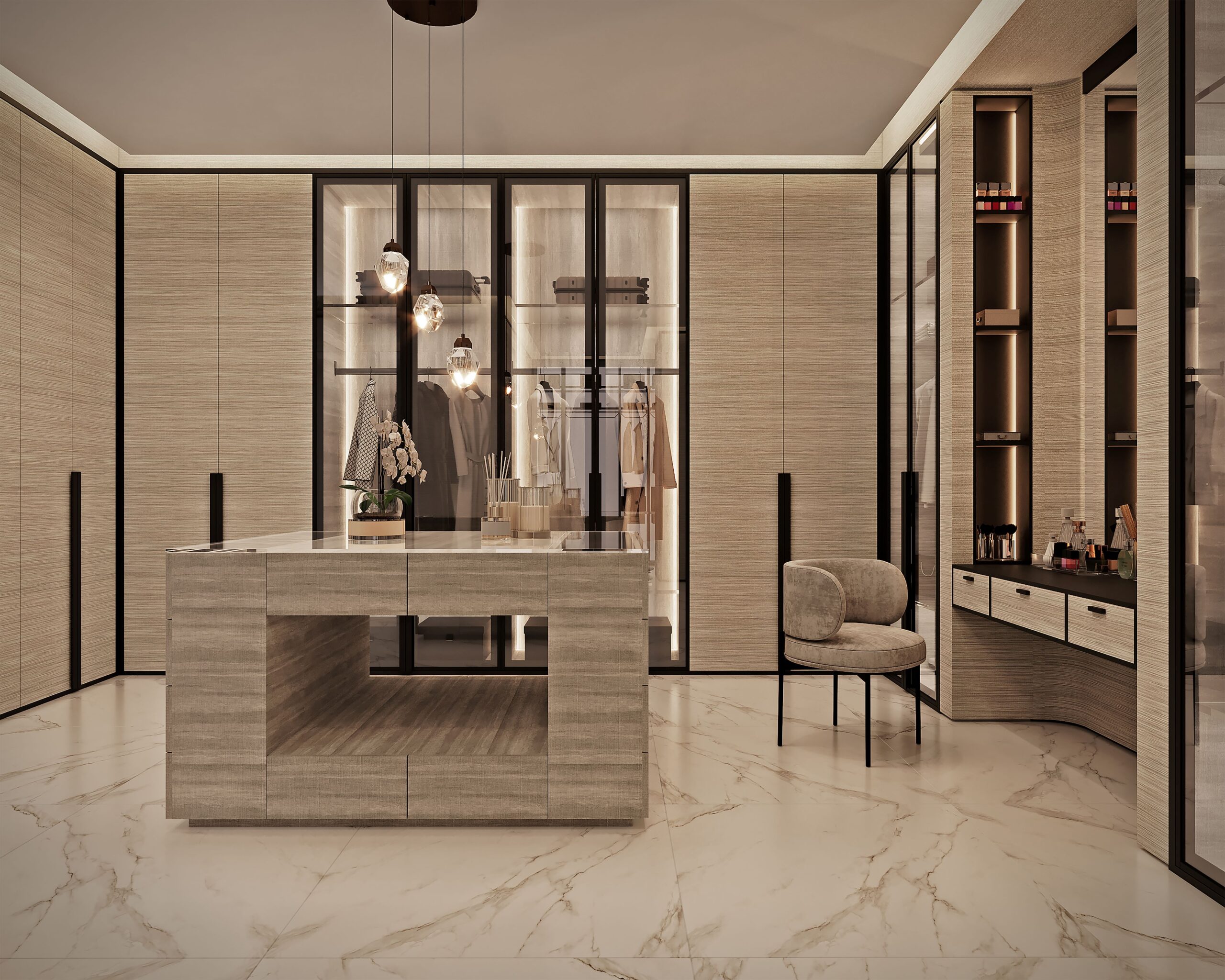 A striking double-height lobby showcasing a four-marble floor, draped contemporary chandelier and custom-made abstract mirror welcomes visitors into the residence. Materials have been carefully selected to create a dynamic and richly textured entrance. The earthy tones featured in the distinctive marble flooring introduce the neutral, bronze and burgundy color palette that unifies the space. Two burgundy marble framed entrances open into the basement majlis. In the majlis, the eye is drawn to the natural beauty of an open book marble wall and a wallcovering featuring an ancient Egyptian representation of the Nile. These stunning focal points offer moments of luxurious artistry. Â The space is infused with exquisite attention to detail, from shelves lined with antique gold bronze to a bespoke carpet and handblown glass chandeliers.