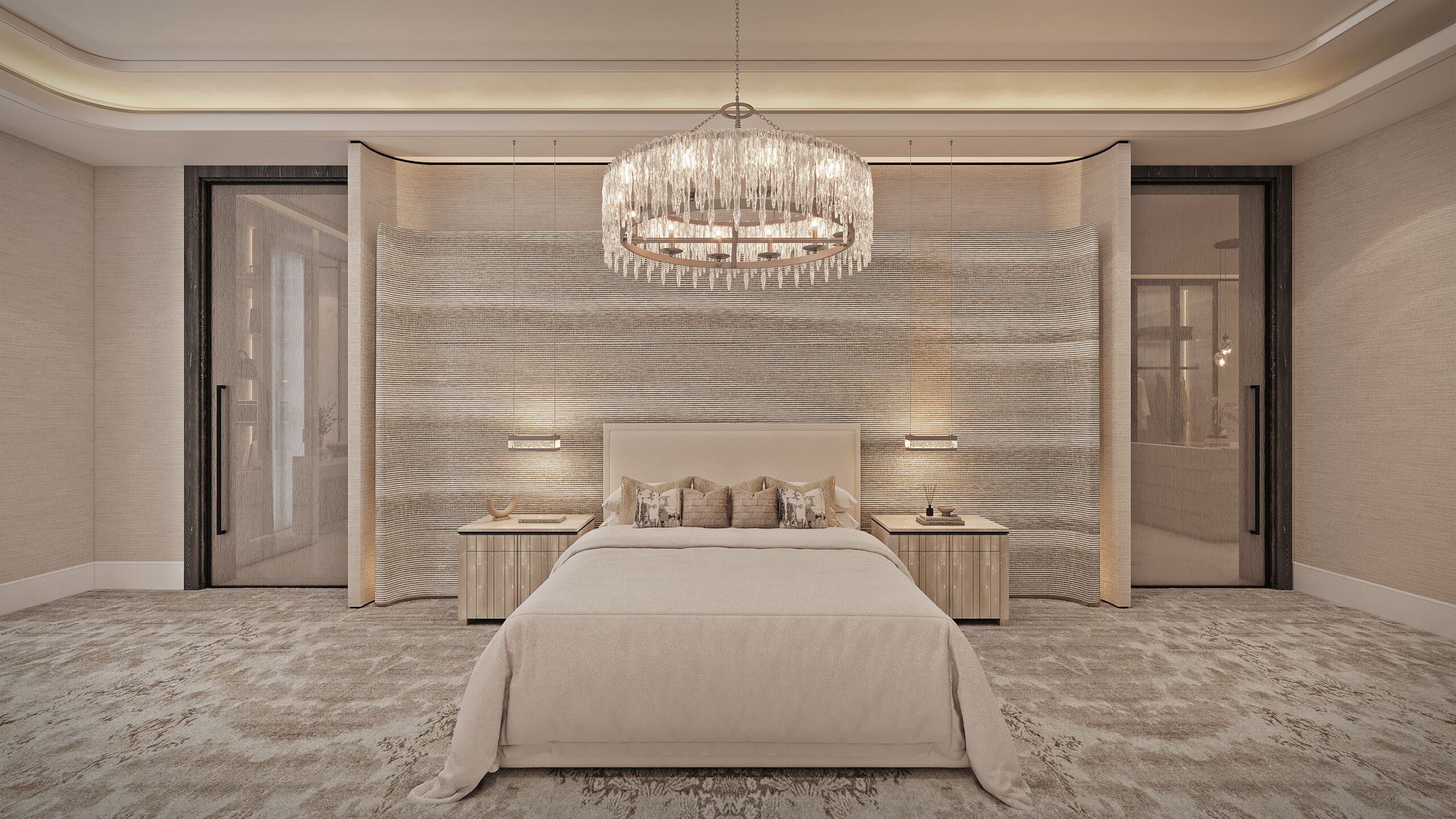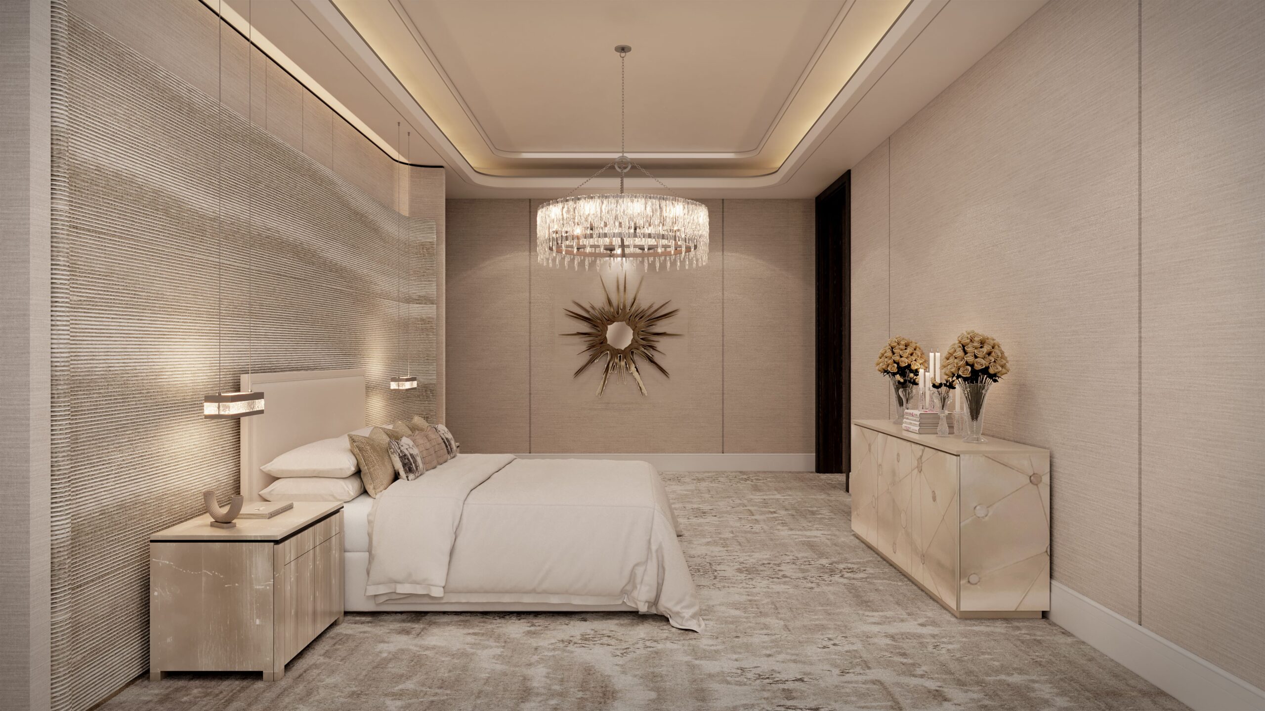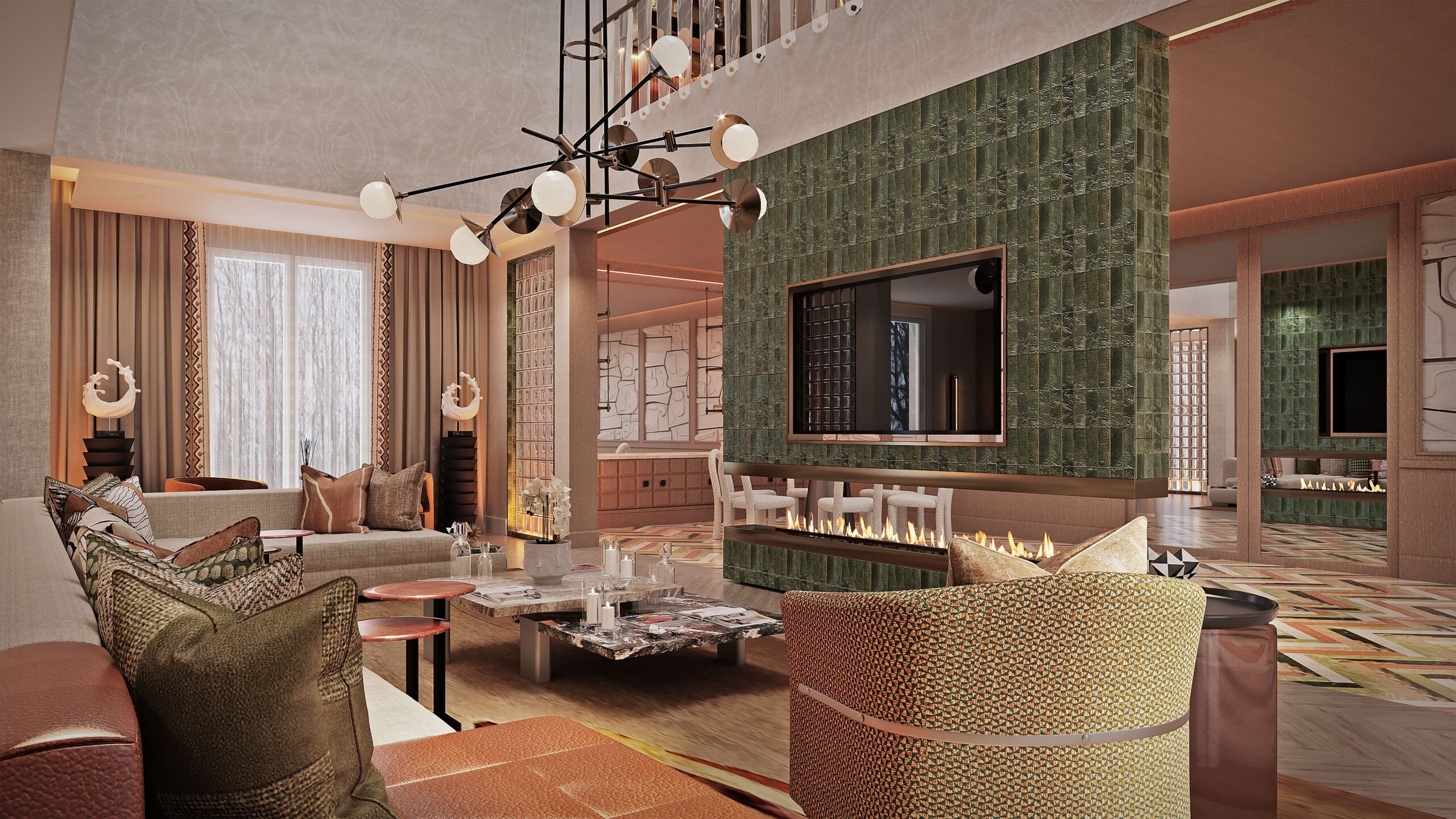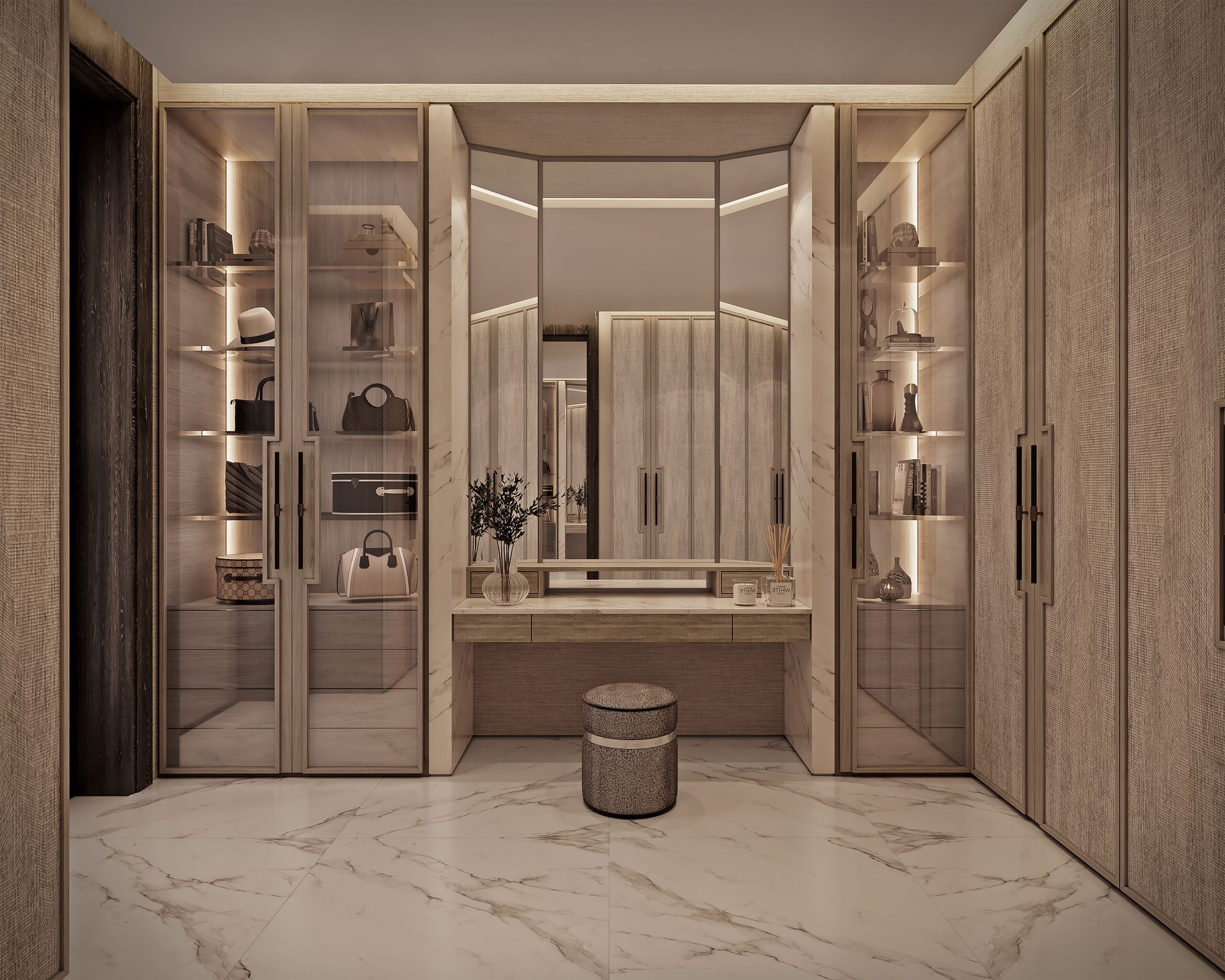 A striking double-height lobby showcasing a four-marble floor, draped contemporary chandelier and custom-made abstract mirror welcomes visitors into the residence. Materials have been carefully selected to create a dynamic and richly textured entrance. The earthy tones featured in the distinctive marble flooring introduce the neutral, bronze and burgundy color palette that unifies the space. Two burgundy marble framed entrances open into the basement majlis. In the majlis, the eye is drawn to the natural beauty of an open book marble wall and a wallcovering featuring an ancient Egyptian representation of the Nile. These stunning focal points offer moments of luxurious artistry. Â The space is infused with exquisite attention to detail, from shelves lined with antique gold bronze to a bespoke carpet and handblown glass chandeliers.
