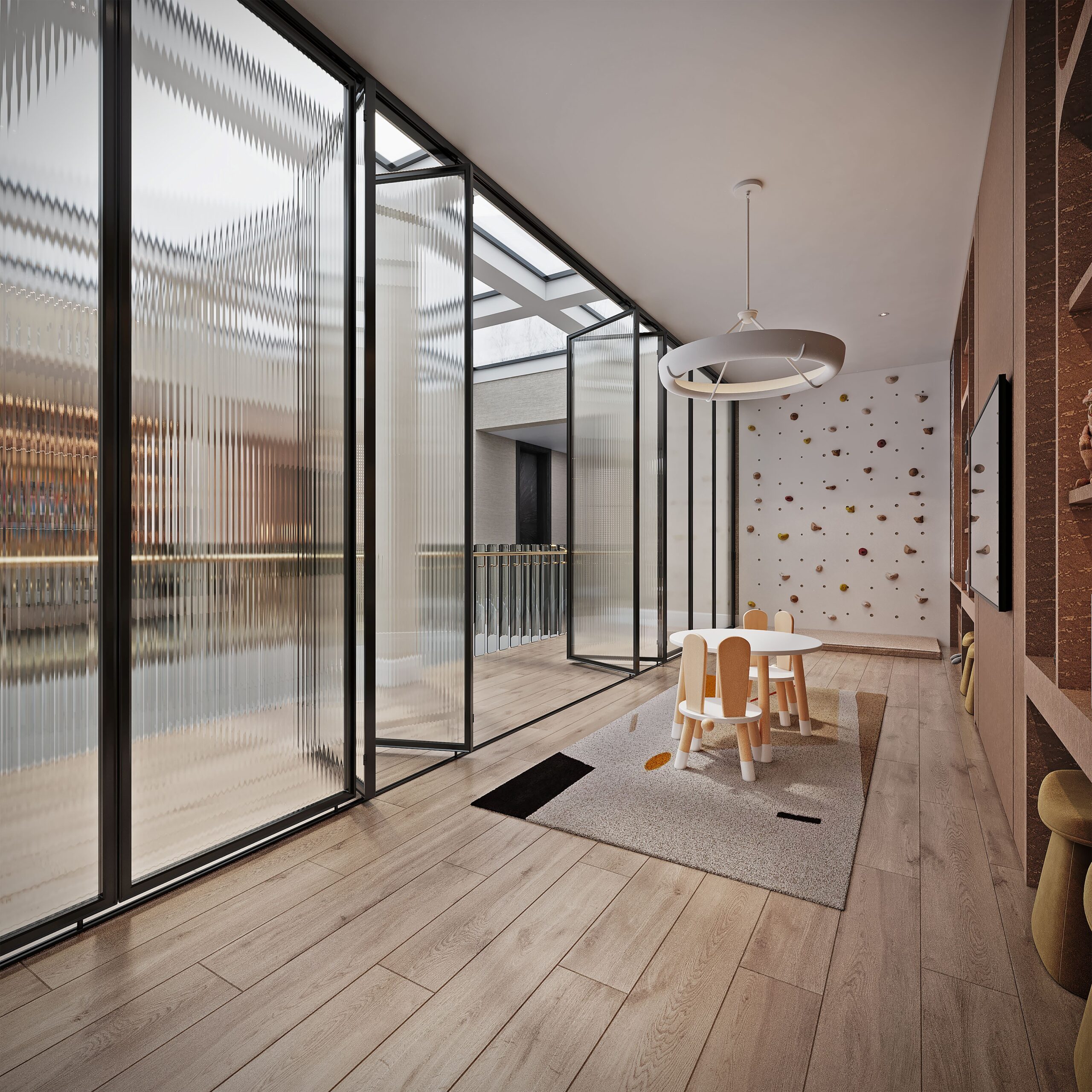 The bedroom, sitting room and closet are areas of quiet luxury and calm. The neutral color palette of grey and cream with black accents is elegant and timeless. Soft furnishings and clean lines create a feeling of sanctuary. Throughout the residence, Yasmin Alsdais Interiors balances form with function. In the playroom smart storage solutions organize the space, while blackboard and climbing walls encourage all aspects of the room to be used and interacted with.